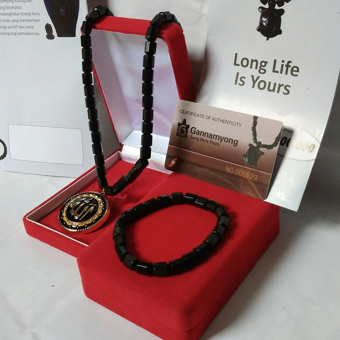 GANNAMYONGKalung dan gelang kesehatan asli korea Gannamyong adalah kalung dan gelang kesehatan yang terbuat dari Tourmaline yang mengandung far infrared 99%. Dengan kata lain Gannamyong dapat digunakan sebagai alat bantu terapi far infrared. Selain mengandung far infrared, Gannamyong juga mengandung Ion Negatif, dan Neodymium Magnet.- Kalung Gannamyong mengandung serbuk batu Tourmaline yaitu sama dengan 3 terapi sebagai berikut :1. terapi far infrared, yang dapat :* meningkatkan stamina, segar dan tidak mudah lelah* menurunkan tekanan darah* mengandung vit D (pegal linu hilang)* mengurangi sakit kepala dan asam lambung2. terapi ion negatif, yang setara dengan terapi dari alam pegunungan, air terjun dan tempat tempat yang masih asri dan bersih3. terapi bio magnetik, biasanya kita sering terkena radiasi hp atau barang elektronik lainnya, dengan terapi bio magnetik, ph tubuh dapat kembali seimbangGannamyong bekerja dengan cara memancarkan sinar infra merah jarak jauh atau far infrared bersamaan dengan daya magnet. Memiliki 8 (delapan) sisi atau octagon yang mewakili 8 (delapan) organ utama: jantung, hati, paru-paru, ginjal, pankreas, limpa, darah dan otak. Manfaat yang dirasakan beragam dari masing-masing orang tapi pada umumnya pengguna mengalami peningkatan daya tahan tubuh seperti tidak mudah sakit dan lebih fit. Penggunaan kalung gannamyong tidak akan menyebabkan iritasi kulit. Jadi aman untuk kulit. Hadir dalam pilihan liontin :- Kura kura / Lafadz Allahkita jual satu set terdiri:1 kalung & 1 gelangKotakCOA Sertifikat Keasliancara tes: tuangkan air putih ke gelas, teteskan obat merah beberapa tetes lalu masuk kan kalung atau gelang gannamyong ke dalam gelas, maka beberapa saat kemudian warna air kembali putih spt sem