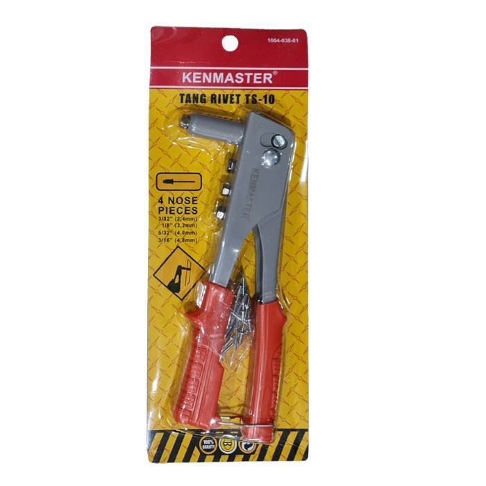 Merk : KenmasterTipe : TS-10Tang Rivet/RipetHandle KaretUkuran : 9.5 InchUntuk penggunaan 4 ukuran paku rivet (2.4 mm, 3.2 mm, 4.0 mm, & 4.8 mm)Kenmaster Tang Rivet dengan Handle Karet untuk pekerjaan rivet yang lancar, mudah dan dapat dioperasikan dengan 1 tangan. Memiliki nozzle yang dapat disesuaikan dengan kebutuhan. Sering digunakan pada pekerjaan rumah yang membutuhkan paku rivet. Untuk penggunaan 4 ukuran paku rivet (2.4 mm, 3.2 mm, 4.0 mm, & 4.8 mm). Dengan BONUS beberapa paku rivet bawaan p
