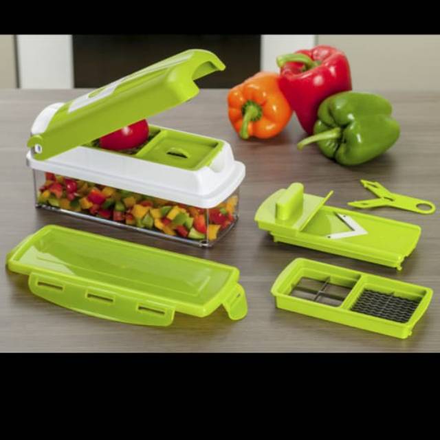 Pemotong Ajaib ini adalah alat potong buah dan sayur dengan menggunakan pisau serbaguna. - Memiliki 11 macam pisau pemotong. Dengan mudah bisa memotong, mengiris, menurut dengan berbagai ukuran dan type. - Tidak menggunakan listrik- Mudah dibersihkan- Menghemat waktu memasak anda1 set terdiri dari :- Penutup wadah yang dilengkapi kancing untuk dapat dibuka pada saat membersihkan- Perangkap untuk menancapkan makanan saat kita memotong- Wadah/container transparan- Pisau pemotong 6x6mm / 12x12mm- Pisau pemotong 18x18mm / 6x36mm- Pisau pemotong quarter- Partikel untuk menutup mata pisau- Pisau untuk mengupas kulit- Penutup wadah / containerWadah container plastik berkapasitas +- 1