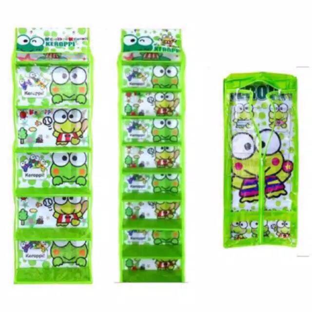 Ready...Segera di order. Satu set rak gantung tas, sepatu + kerudung.Warna Pink hello KittyHijau keropiBiru Dora