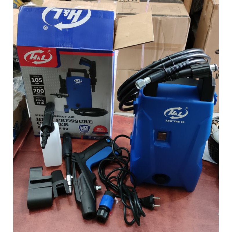 Detail Produk H&L ABW VRS 60 Mesin Cuci SteamDetail : Jet Cleaner type ABW VRS 60 Working Pressure : 60 Bar Working Flow Rate : 5.5 Liter / menit Motor Capacity : 700W Voltage : 220V / 50Hz Kegunaan & Keistimewaan : •Bisa sedot air dari dalam ember. •Bisa menggunakan Gun Stick Jet Cleaner Type VGS 70, VBB 70 dan QL-1200 •Selang compatible dengan selang VGS 70, VBB 70 dan QL-1200 •Bisa digunakan untuk cuci mobil, motor, AC dan lainnya .Alat steam / pembersih Terbaru dari H&L Daya semprot kuat dan kencang maksimal.Isi Dus & Kelengkapan : 1 Unit High Pressure ABW VRS 60 + Kotak kardus 1 Gun Jet cleaner 1 botol sabun 1 selang jet cleaner 5meter 1 Quick Connecting Manual Book & Kartu Ga