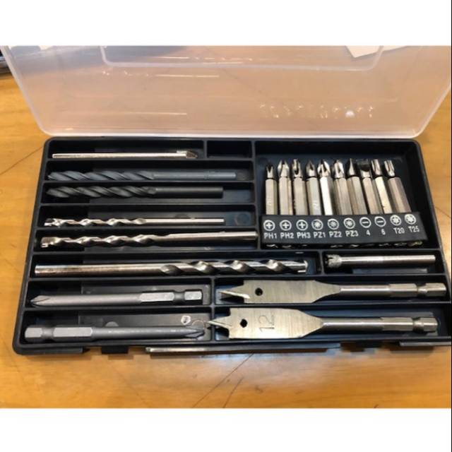 isi 21pc sesuai foto10pc mata obeng panjang 65mmmata kayu: 10mm 12mmmata bor beton: 5,6,8mmmata bor besi: 5,6mmmata keramik 6mmmata obeng xtra panjang : CR-V