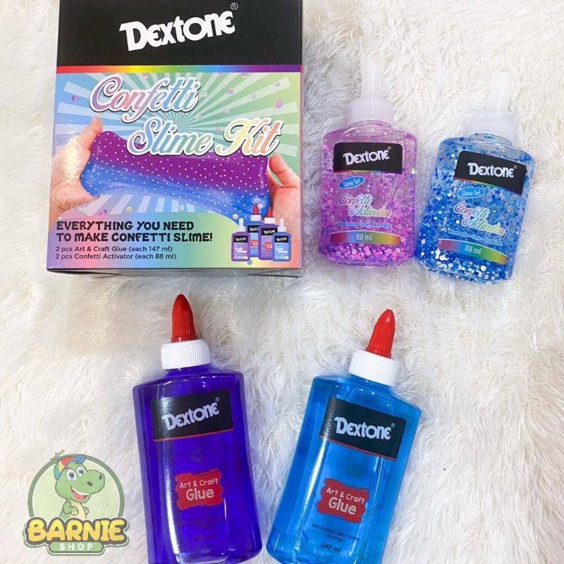 CONFETTI SLIME KITDextone Confetti Slime kit terdiri dari Transparent Art & Craft Glue, Confetti Activator dan resep untuk membuat slime. dapat digunakan untuk crafting, bermain atau tugas sekolah. tidak beracun dan mudah dicuci, sangat aman untuk anak-anak. Set Detail : Confetti Slime Kit1 botol Art & Craft Glue Glue (147ml) 1 botol Art & Craft Glue Purple (147ml) 1 botol Blue confetti Activator (88ml) 1 botol Purple Confetti Activator (88ml) 1 resep membuat slimeDaerah pengiriman :Gojek / Grab : instant kurir max 20 kg / sameday 7kghappy shopping moms DIJAMIN 100 % ORIGINALHATI2 DENGAN HARGA MURAH, KARENA BARANG ASLI ADA STANDART HARGA UNTUK