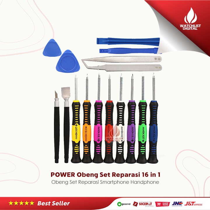 Obeng set dengan berbagai perlengkapan dan mata obeng berbeda yang sangat berguna bagi Anda yang sering mengoprek / membongkar perangkat Smartphone, handphone atau pun gadget komputer lainnya. Tersedia berbagai jenis kepala obeng yang dapat anda sesuaikan dengan kebutuhan anda.16 in 1Tersedia beberapa jenis kepala obeng dan juga perlengkapan untuk memudahkan anda membuka perangkat. Semua kebutuhan obeng Anda tersedia dalam satu paket ini. Sangat berguna terutama untuk Anda yang suka mengoprek smartphone, handphone ataupun perangkat elektronik lainnya.Good Quality MaterialProduk ini terbuat dari bahan baja khusus sehingga tidak mudah berkarat dan juga sangat kuat digunakan dalam jangka waktu lama. Untuk beberapa perlengkapan lainnya terbuat dari plastik yang kuat. Tip obeng juga mempunyai fitur magnetik, sehingga skrup pada perangkat akan segera menempel pada obeng setelah terlepas dan anda dapat menyimpan sekrup ke tempat yang mudah untuk di temukan kembali.Anti Slip HandleSeluruh obeng ini memiliki pegangan dengan material anti slip, sehingga anda tidak akan kesulitan pada saat memutar obeng ketika memperbaiki atau membongkar perangkat anda.In the box :1x T6 Tor x screw driver1x T5 Tor x screw driver1x T4 Tor x screw driver1x 2.0 Straight screw driver1x 1.5 Cross screw driver1x 1.2 Cross screw driver1x 1.2 Star screw driver1x 0.8 Star screw driver2x Paddle2x mount bar1x straight tweezer1x curved tweezer1x Graver1x Sc