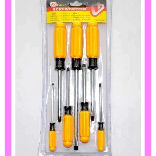 Satu set terdiri dari 7pcs obeng :* (-) 6" x 15cm* (+) 6" x 10cm* (-) 6" x 10cm* (+) 5" x 7.5cm* (-) 5" x 7.5cm* (-) 3" x 7.5cm* (+) 3" x